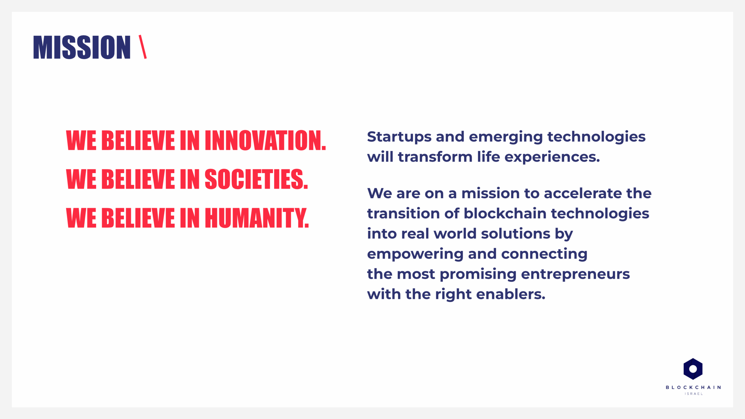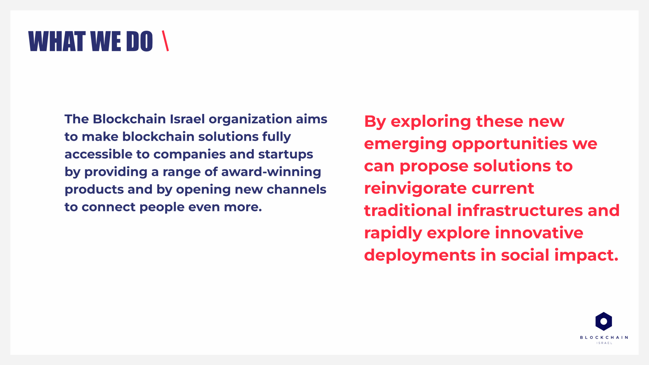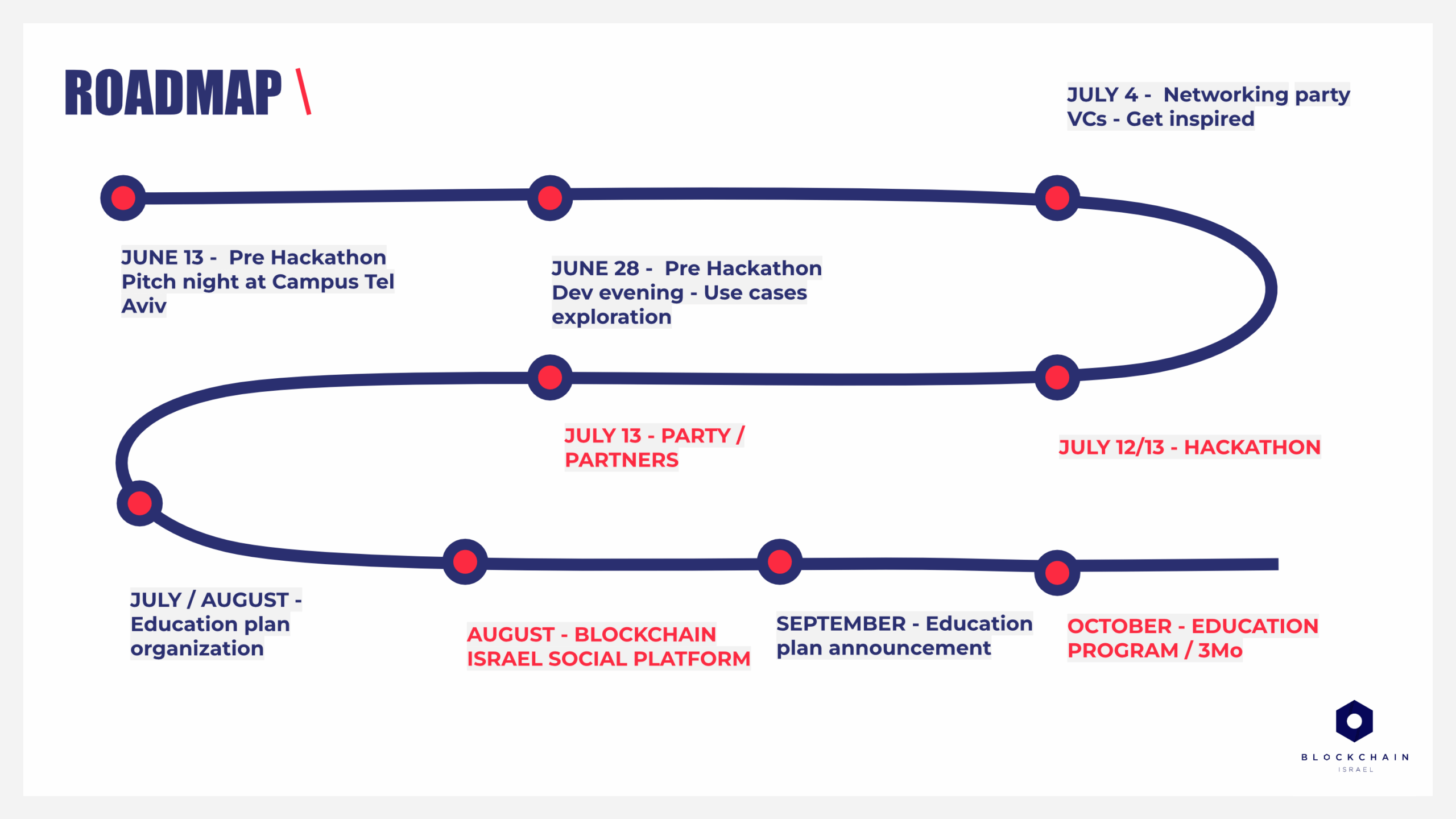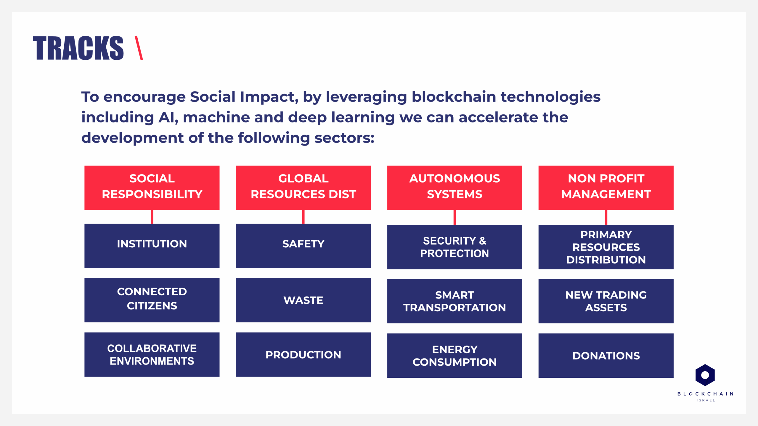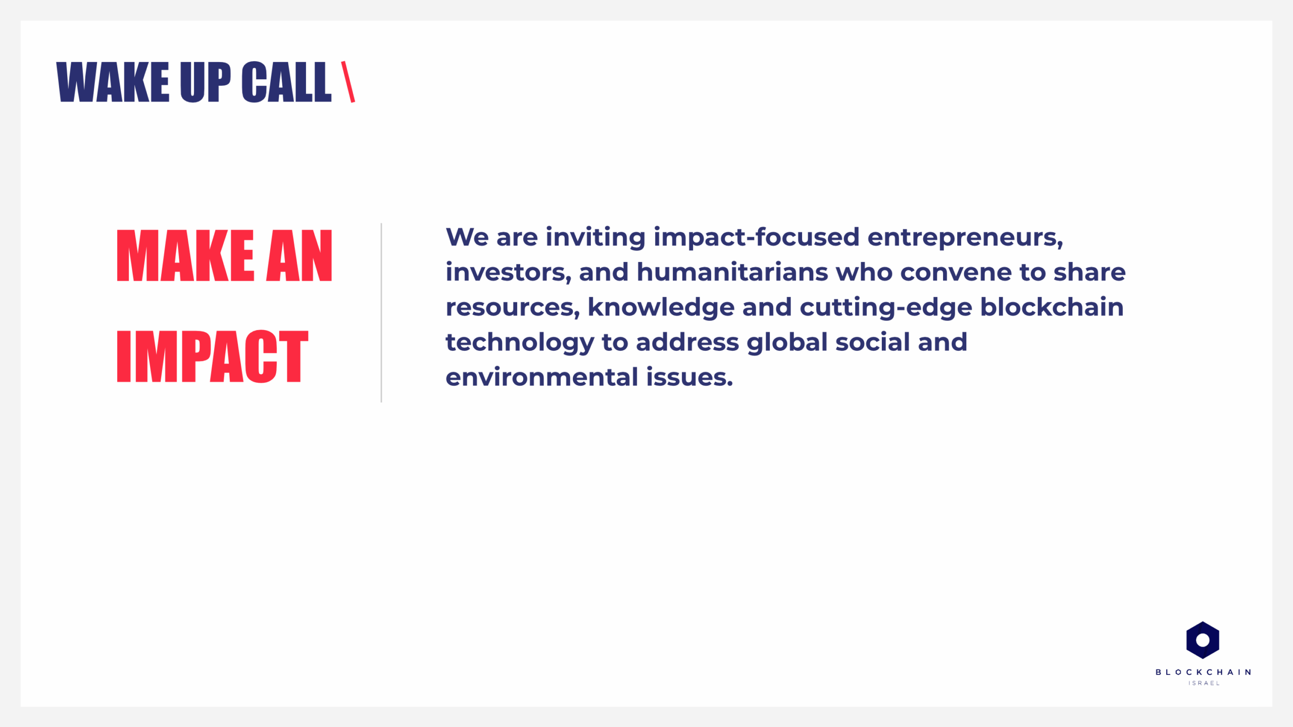 Through storytelling and design clarity, the presentation transformed a complex event structure into a compelling visual experience -> driving engagement, collaboration, and credibility for Blockchain Israel’s broader impact initiatives.