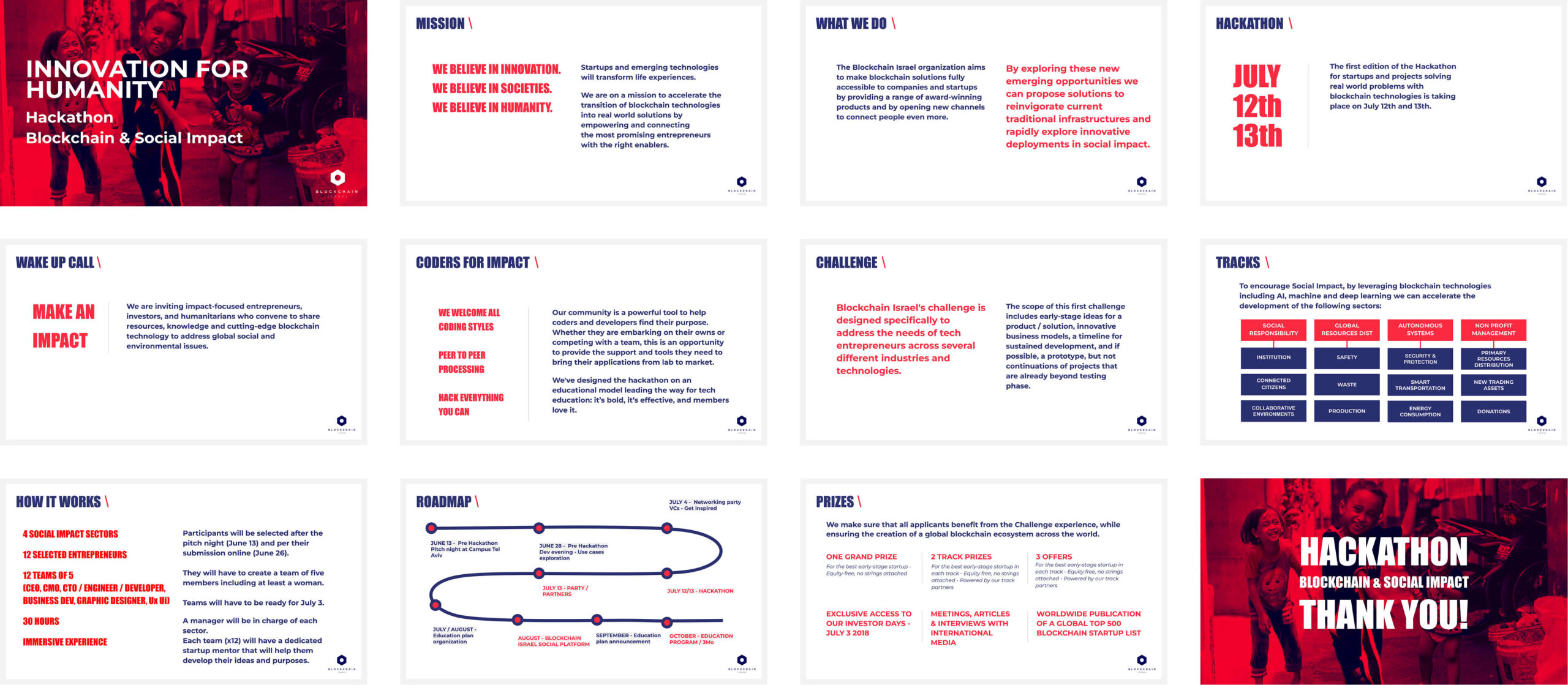 To design a complete event and pitch deck for the Innovation for Humanity Hackathon: a two-day program dedicated to blockchain and social impact. The goal was to create a clear and inspiring narrative that communicated the event’s mission, structure, and value to participants, sponsors, and partners.